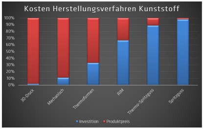 Für kleine Serien von Kunststofferzeugnissen wird deshalb oft 3D-Druck, Drehen oder Fräsen, Thermoformen oder Reaction Injection Moulding (RIM - Polyurethan) gewählt. Beim 3D-Druck und bei der mechanischen Bearbeitung liegen die Investitionen bei Null, bei Thermoformen und RIM sind die Formen relativ günstig.