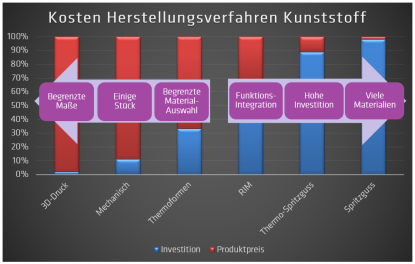 Folgende Übersicht zeigt das Verhältnis zwischen Investition und Produktpreis. Natürlich ist dies – je nach den Anforderungen – für jedes Produkt anders. Unser Vergleich betrifft nur Produkte aus Kunststoff. Alternativ dazu sind andere Materialien, wie Aluminium oder Stahlblech, oft ebenfalls möglich.