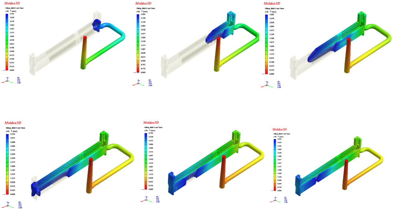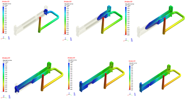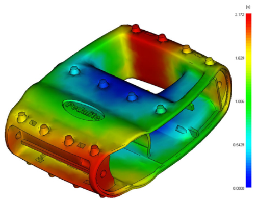 Een moldflow analyse maakt letterlijk zichtbaar hoe de (vloeibare) kunststof de matrijs instroomt en hoe de kunststof vervolgens afkoelt en ‘stolt’.