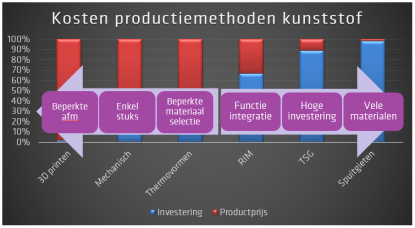 In het volgende overzicht is de verhouding tussen investering en productprijs weergegeven. Natuurlijk is dit - afhankelijk van de eisen – voor elk product anders. De vergelijking hier betreft alleen producten in kunststof. Als alternatief kunnen andere materialen, zoals aluminium of staalplaat in veel gevallen ook worden gekozen.