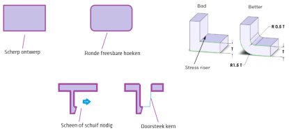 - Een matrijs zonder bewegende delen: voorkom zoveel mogelijk schuiven en schenen. Alternatief: doorsteekkernen of nabewerking. Bij nabewerking zullen de productkosten wel toenemen;