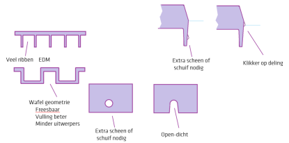 - Een freesbare geometrie. Alles wat in een matrijs moet worden gevonkt of geëtst zorgt voor toename van de investering. Voorbeelden: afrondingen, kleine ruimtes en complexe vormen;