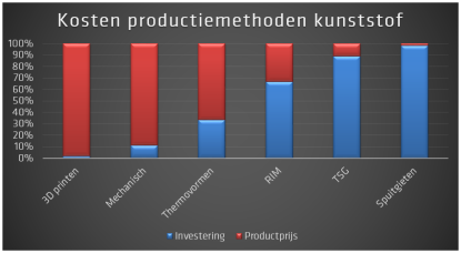 Voor kleine series kunststof producten wordt daarom vaak gekozen voor 3D printen, draaien of frezen, thermovormen of RIM (polyurethaan). Met 3D printen of mechanisch bewerken zijn de investeringen nihil, bij thermovormen of RIM zijn de mallen relatief goedkoop.